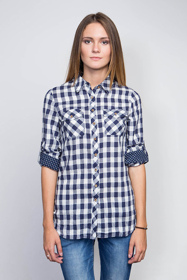 Рубашка в клетку с длинным рукавом. Модель удлиненная, приталенного кроя, изготовлена из облегченной хлопковой ткани. При желании длинный рукав можно трансформировать в 3/4, для этого на рукавах имеются пуговицы и специальные прихваты. Рубашка отлично впишется в повседневной гардероб любой модницы.